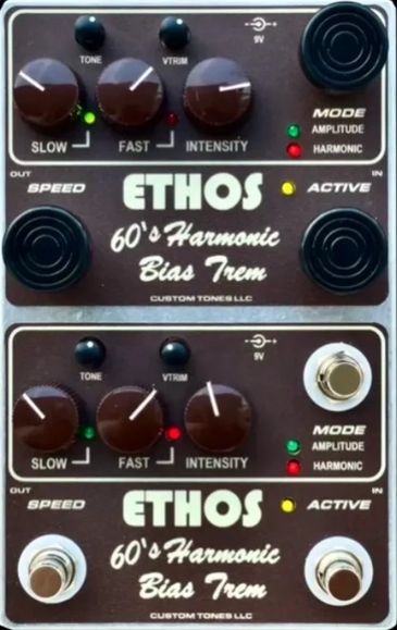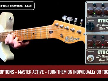 "Hey Rob- I wanted to use the HT pedal on a bunch of shows and studio stuff before I wrote you about it. It is great, of course. The build quality is absolutely top notch. The wide range of useful settings that are easily accessible make it a pleasure to use. The slow-fast switch is perfect…..The real surprise is the boost feature. A lot of modern pedals have a built in adjustable boost, but yours has a much better tonal quality. It is lush and warm not just louder. I even use it alone sometimes with the three main knobs turned to zero. Set to just past 12 o’clock it really adds a high quality warm expansion that I haven’t heard anywhere else. So many thanks for this pedal. I love it. If you ever make a reverb pedal I’d be all set with the Ethos Overdrive, HarmonicTrem and Customtones Reverb that’s all I would need. All the best"…..GE
